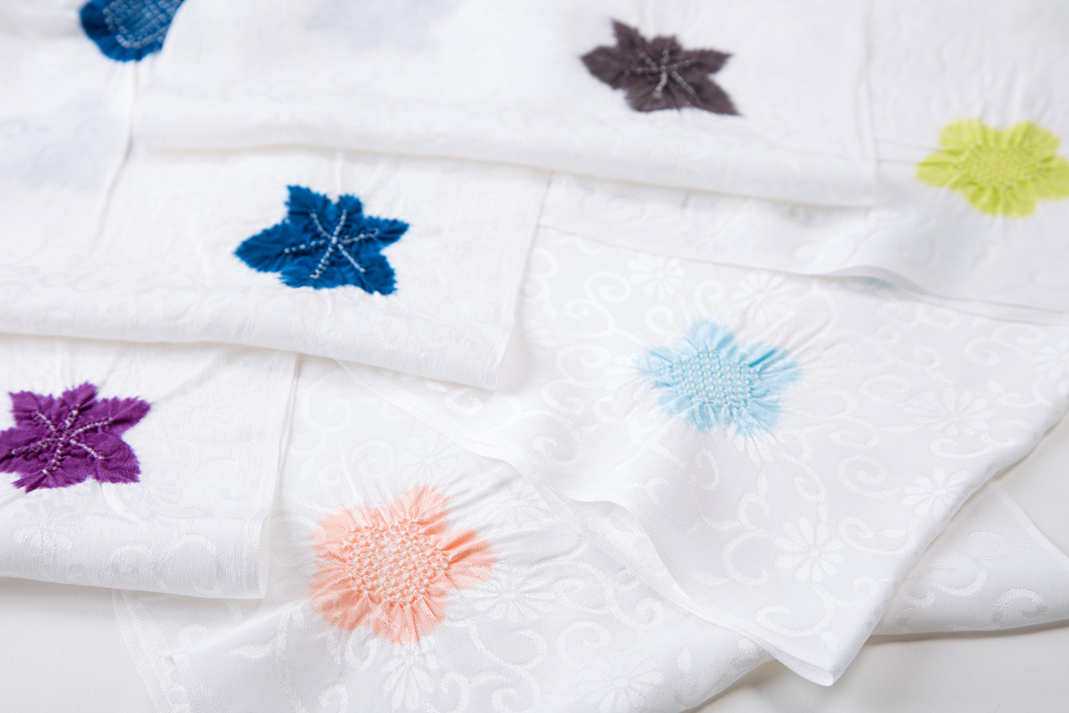 定番の輪出し絞りの帯揚げです 梅と楓を交互に配置しています 弊社の絞りは鹿の子の柄数を多くしております